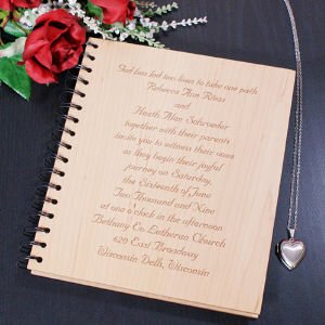Personalized Wedding Invitation Wood Photo Album - Engraved Wedding Invitation Photo Album Make a memorable wedding gift with our Personalized Wedding Invite Photo Album. Simply provide us with the wording on their wedding invitation and we will create a lovely Wedding Keepsake the Bride & Groom can use for their most treasured photos. This engraved wood photo album is not just for a wedding invites. Personalize your photo album with any custom message as well. Our Personalized Wood Photo Album measures 7 2/3" x 8 3/4" and holds 72 4" x 6" photos. Includes FREE Personalization! Personalize your Photo Album with any couples wedding invitation wording. Just type in the invitation copy below up to 14 lines and up to 50 characters per line max. We then engrave it on this attractive Wedding Wood Photo Album. Please enter a backslash to separate each line.